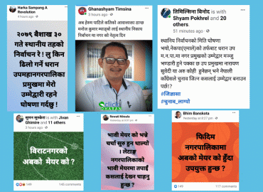 धरान: मन्त्रिपरिषद बैठकले सोमबार स्थानीय तह निर्वाचन गर्ने निर्णय गरेलगत्तै स्थानीय तहमा उम्मेद्वारको खोजी शुरु भएको छ । स्थानीय तहहरुमा अबको मेयर पदको उम्मेदवार को होला ? भन्ने चासो र चर्चा शुरु भएको हो । सरकारले आगामी बैशाख ३० गते एकै चरणमा स्थानीय तहको निर्वाचन गर्ने निर्णय हिजो गरेको थियो ...