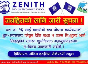 धरान: धरानको वडा नं १६ लाई आइतबार बालमैत्री वडा घोषणा गरिदैछ । सोही अवसरमा वडा नं १६ स्थित इङ्गलिस सेकेण्डरी बार्डिङ्ग स्कुलले निःशुल्क भर्ना कार्यक्रमको घोषणा गरेको छ । जेनिथ् स्कुलका भाइस प्रिन्सिपल पूजा जवेगु ताम्रकारले वडा नं १६ लाई बालमैत्री घोषणाको अवसरमा प्ले ग्रुपदेखि कक्षा ५ सम्म निःशुल्क ...