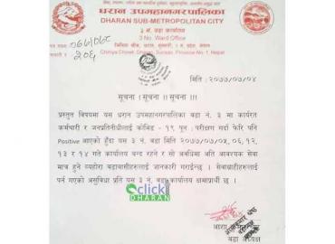 धरान: कर्मचारी र जनप्रतिनिधिको पुनः पिसिआर परिक्षण गर्दा पनि रिपोर्ट पोजेटिभ आएपछि धरान उपमहानगरपालिका ३ नम्बर वडा कार्यालय फेरि बन्द भएको छ । अत्यावश्यक काम मात्र गर्ने गरि आज बुधबारदेखि वडा कार्यालय बन्द गरिएको अध्यक्ष आशाकुमार श्रेष्ठले जानकारी दिए । ‘पुनः चेक गर्दा कोरोना पोजेटिभ नै आयो, ...