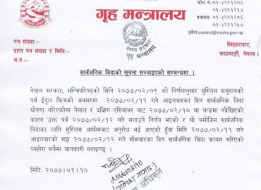 धरान: मुस्लिम समुदायको पर्व ईदुल फित्रको अवसरमा आज दिइएको विदा सरकारले सच्याएको छ । गृहमन्त्रालयले सुचना जारी गर्दै आज आइतबारको सट्टा सोमबार सार्वजनिक विदा कायम गरिएको जनाएको छ । सरकारले ईदको अवसरमा आज सार्वजनिक विदा दिएको थियो । तर, दक्षिण एसियाबाट हिजो चन्द्रमा नदेखिएको कारण मुस्लिम समुदायले उक्त ...