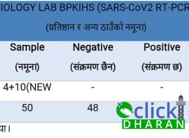धरान: वीपी कोइराला स्वास्थ्य विज्ञान प्रतिष्ठान धरानमा परीक्षण गरिएको पछिल्लो एक दर्जन स्वाबको रिपोर्ट पनि नेगेटिभ आएको छ । प्रतिष्ठानका अनुसार हिजो आइतबार साँझ १२ वटा स्वाबको नमुनाको परीक्षण रिपोर्ट नेगेटिभ आएको हो । प्रदेशको विभिन्न ठाउँबाट संकलन भएको १४ वटा स्वाबमध्ये १२ वटाको परीक्षण गरिएको थिय ...